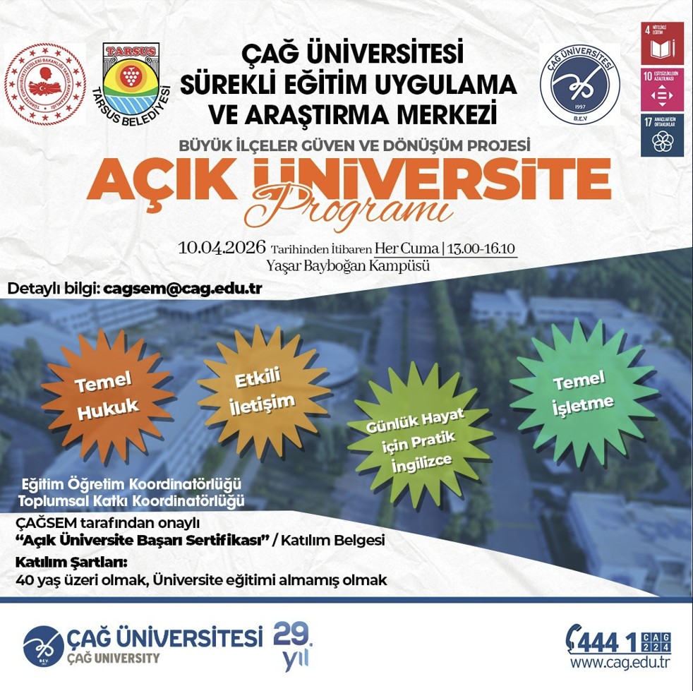 Üniversitemiz Sürekli Eğitim Uygulama ve Araştırma Merkezi bünyesinde, Eğitim Öğretim, Toplumsal Katkı Koordinatörlüğümüz, Tarsus Kaymakamlığı ve Tarsus Belediyesi iş birlikleriyle düzenlenen programımız için ayrıntılı bilgi ve kayıt linki; https://forms.gle/zeXFvVVy8HqFNs9i6