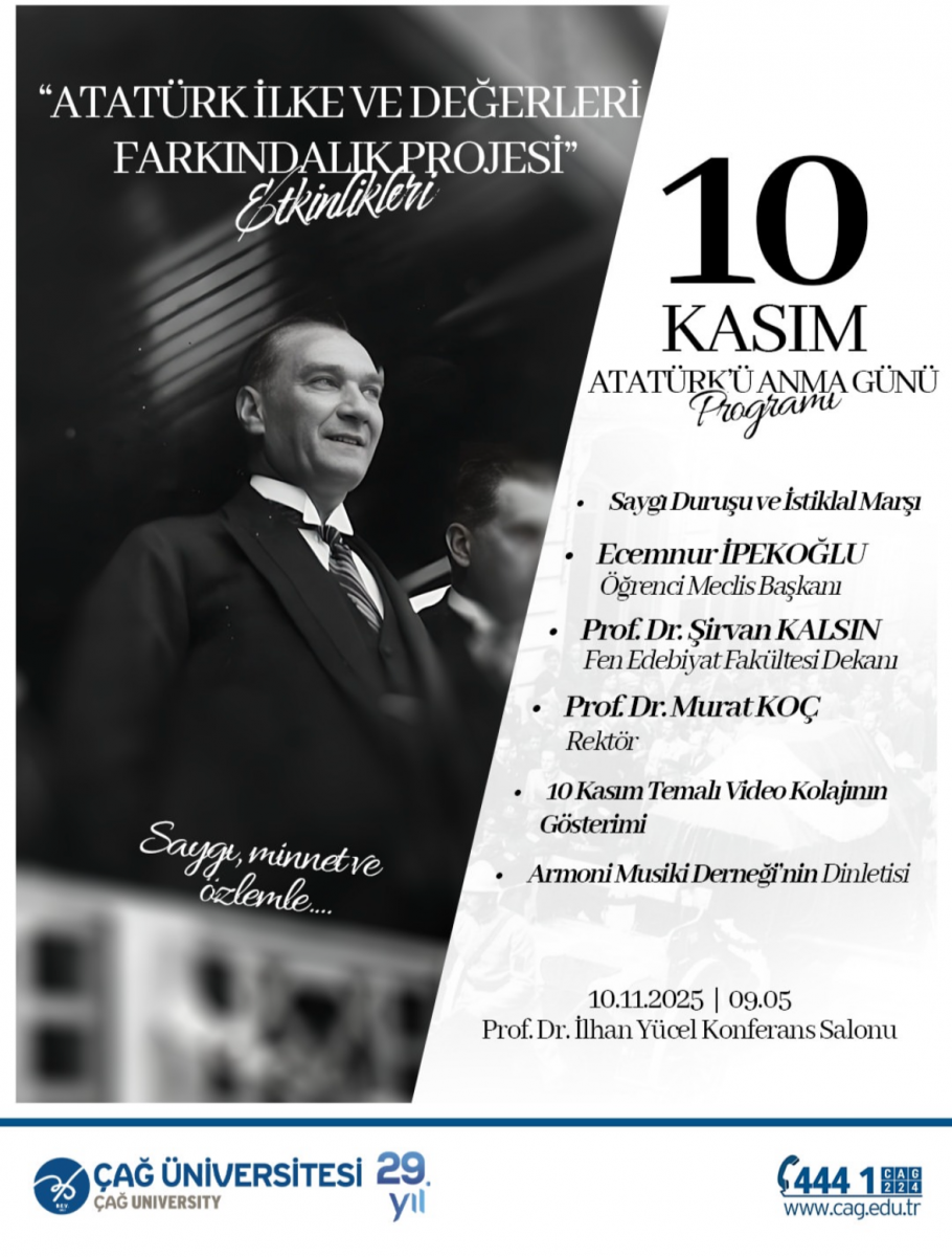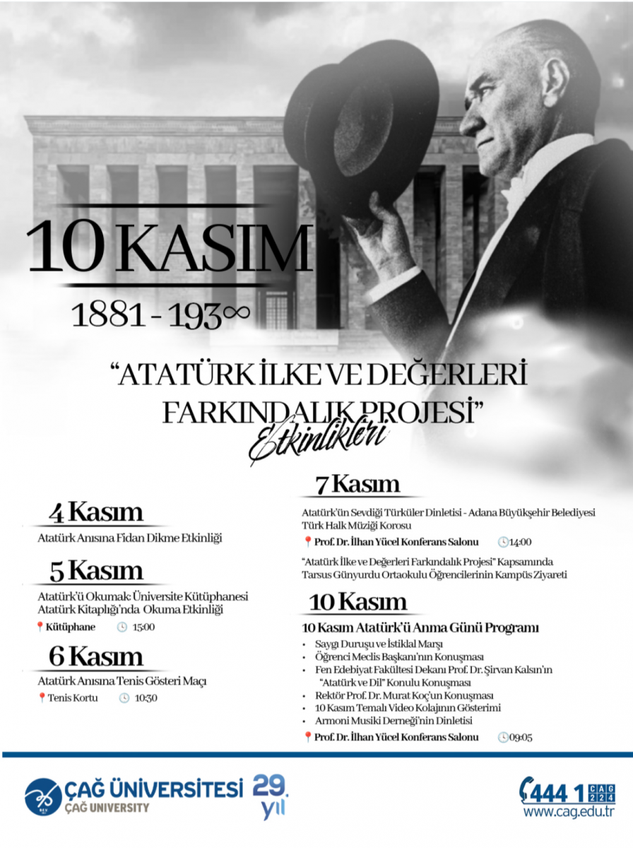 Çağ Üniversitesi olarak, Ulu Önder Mustafa Kemal Atatürk’ü anmak ve onun ilke ile değerlerini gelecek nesillere aktarmak amacıyla “Atatürk İlke ve Değerleri Farkındalık Projesi” kapsamında bir dizi etkinlik düzenlenmiştir.