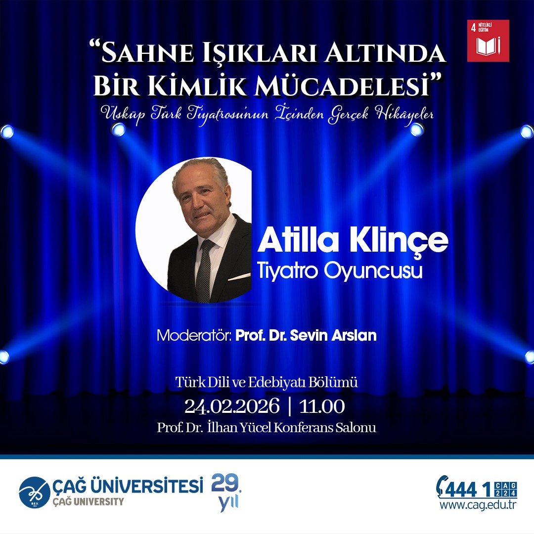 Türk Dili ve Edebiyatı Bölümü tarafından düzenlenen söyleşide tiyatro oyuncusu Atilla Kılınç, “Sahne Işıkları Altında Bir Kimlik Mücadelesi: Üsküp Türk Tiyatrosu’nun İçinden Gerçek Hikâyeler” başlıklı konuşmasıyla öğrencilerimizle buluşacaktır. Etkinliğin moderatörlüğünü Prof. Dr. Sevin Arslan yürütecektir.
