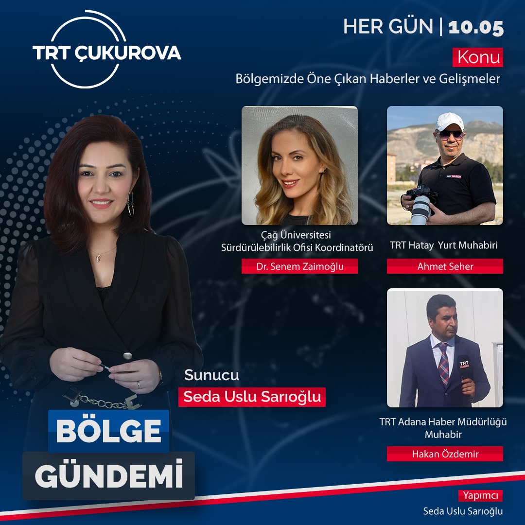 Çağ Üniversitesi Fen Edebiyat Fakültesi İngilizce Mütercim ve Tercümanlık Bölümü öğretim üyesi ve Üniversitemiz Sürdürülebilirlik Ofisi Koordinatörü Dr. Senem Zaimoğlu, TRT Çukurova ekranlarında yayınlanan “Bölge Gündemi” programına konuk olarak “Yeşil Yetenekler ve Üniversite Eğitimi” konusunu değerlendirdi.