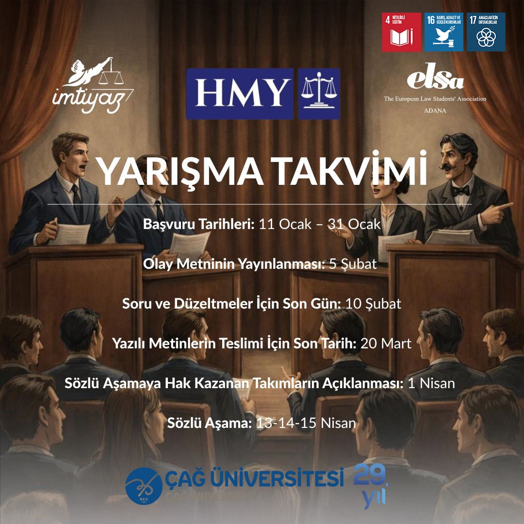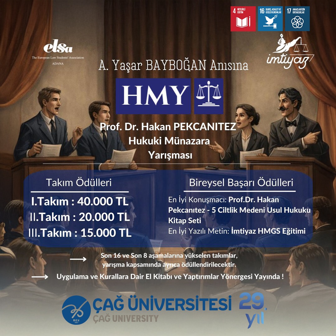 Bu yıl ikincisi düzenlenecek olan ELSA Adana A. Yaşar Bayboğan Anısına Prof. Dr. Hakan Pekcanıtez Hukuki Münazara Yarışması, Çağ Üniversitesi ana sponsorluğunda gerçekleştirilecektir.