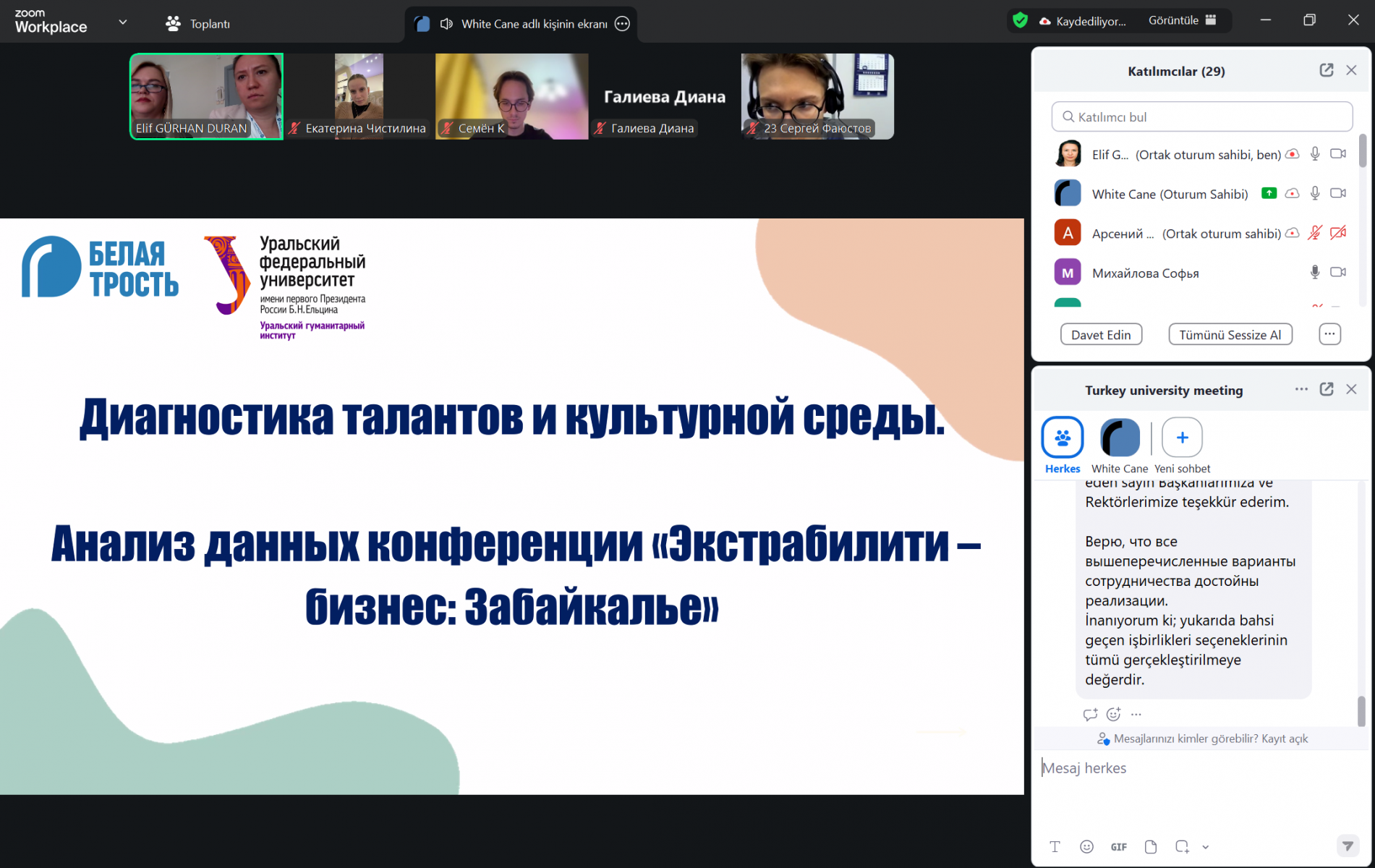 Seminerde, engelli bireylerin eğitim, istihdam ve sosyal yaşamda karşılaştıkları sorunlara çözüm üretmeye yönelik akademik sunumlar ve iyi uygulama örnekleri paylaşıldı. Ural Federal Üniversitesi ve Çağ Üniversitesi’nden akademisyenler, engellilik alanındaki güncel araştırmalar ve projeler hakkında bilgi verirken, Rusya Beyaz Baston Derneği temsilcileri de görme engellilere yönelik farkındalık çalışmalarını anlattı.