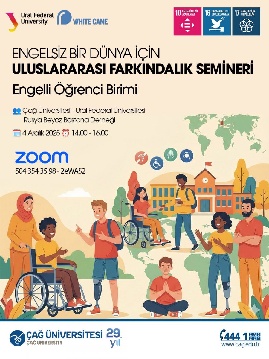 Dünya Engelliler Günü kapsamında Çağ Üniversitesi,Tarsus Engelliler Platformu, Ural Federal Üniversitesi ve Rusya Beyaz Baston Derneği iş birliğiyle uluslararası bir seminer düzenledi. Çevrim içi olarak gerçekleştirilen etkinlikte, farklı ülkelerden uzmanlar, akademisyenler ve sivil toplum temsilcileri bir araya gelerek engelli bireylerin toplumsal hayata katılımı, erişilebilirlik ve uluslararası iş birliği konularını ele aldı.