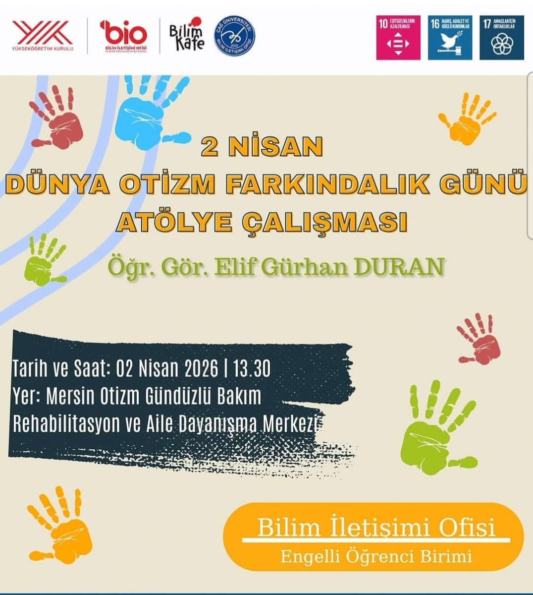 2 Nisan Dünya Otizm Farkındalık Günü kapsamında Bilim İletişimi Ofisi ve Engelli Öğrenci Birimi iş birliğinde üniversitemiz Engelli Öğrenci Birim sorumlusu Öğr. Gör. Elif GÜRHAN DURAN tarafından Aile ve Sosyal Hizmetler Bakanlığı'na bağlı Mersin Otizm Gündüzlü Bakım Rehabilitasyon ve Aile Dayanışma Merkezi'nde hizmet alan otizmli çocukların ebeveynleri ve kurum çalışanları ile atölye çalışması yapılarak farkındalık etkinliği gerçekleştirilmiştir.