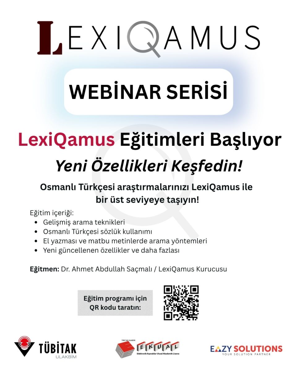 TÜBİTAK ULAKBİM EKUAL kapsamında erişime açılan LexiQamus veri tabanının etkin kullanımını desteklemek amacıyla bir webinar serisi düzenlenmektedir.