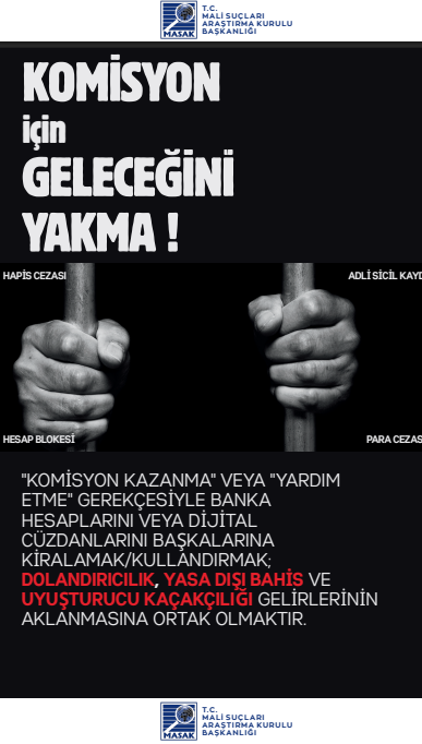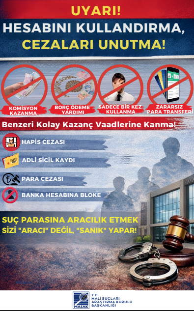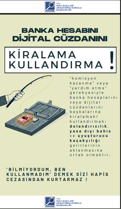 Son dönemde üniversite öğrencilerine ait banka hesapları ve dijital cüzdanların üçüncü kişiler tarafından kullanılması suretiyle dolandırıcılık, yasa dışı bahis ve uyuşturucu kaçakçılığı gelirlerinin aklanması gibi olaylarda ciddi artış yaşanmaktadır. Kendi adınıza kayıtlı banka hesaplarınızın veya dijital cüzdanlarınızın; “komisyon kazanma”, “borç ödeme yardımı”, “sadece bir kez kullanma”, “zararsız para transferi” veya benzeri gerekçelerle başkaları tarafından kullanılmasına bilerek ve isteyerek izin verilmesi, Türk Ceza Kanunu ve ilgili mevzuat kapsamında cezai ve hukuki sorumluluk doğurabilir.