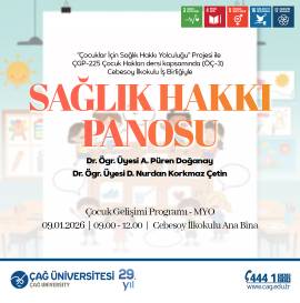 Projenin son ayağı olarak 09.01.2025 tarihinde, Çağ Üniversitesi Meslek Yüksekokulu Çocuk Gelişimi Programı gönüllü öğrencilerinin katılımıyla, çocukların sağlık hakkı konusunda edindikleri bilgileri resimler ve oyun temelli uygulamalar yoluyla ifade ettikleri “Sağlık Hakkı Panosu” etkinliği gerçekleştirilecektir.