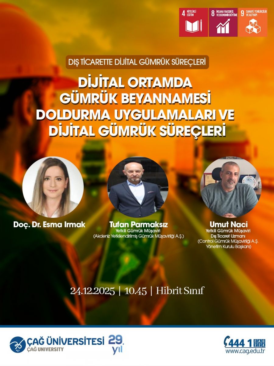 "Gümrük Mevzuatı dersi kapsamında, dersin yürütücüsü Doç. Dr. Esma Irmak’ın moderatörlüğünde Yetkili Gümrük Müşaviri Tufan Parmaksız ile Gümrük Müşaviri–Dış Ticaret Uzmanı Umut Naci’nin derse davetli konuşmacı olarak katılımıyla “Dijital Ortamda Gümrük Beyannamesinin Hazırlanması ve Dijital Gümrük Süreçleri” başlıklı etkinlik düzenlendi. Etkinlik sayesinde öğrenciler, gümrük beyannamesinin dijital ortamda hazırlanmasına ilişkin teorik bilgilerini uygulamaya dayalı örneklerle pekiştirme imkânı buldu.