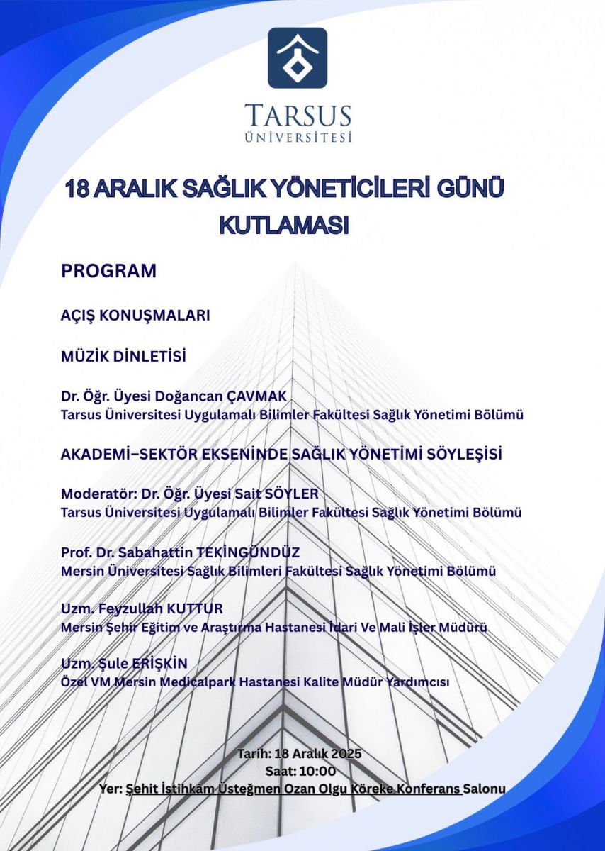 Tarsus Üniversitesi ev sahipliğinde gerçekleştirilen "18 Aralık Sağlık Yöneticileri Günü Kutlaması" programına, Meslek Yüksekokulumuz Sağlık Kurumları İşletmeciliği Programı öğretim elemanları katılım sağladı. Üniversitemiz öğretim elemanlarından Öğr. Gör. Şeyda ÇAVMAK, Öğr. Gör. Adem BİLGİN ve Öğr. Gör. Mehmet ŞENGÜL, sağlık yönetimi alanındaki güncel gelişmelerin ve akademik-sektör iş birliğinin ele alındığı bu anlamlı etkinlikte yer aldılar. Etkinlik kapsamında, sağlık yönetimi bölümü öğrencilerinin ve akademisyenlerin sektör temsilcileriyle buluşması sağlanarak, mesleğin geleceği ve uygulama alanlarındaki yenilikler değerlendirildi.