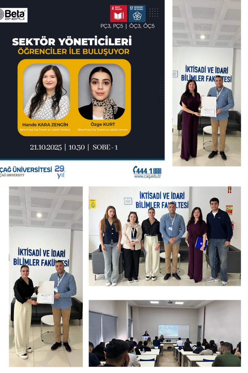 Çağ Üniversitesi Uluslararası Ticaret ve Lojistik Bölümü tarafından yürütülen ITL 101 – International Trade dersi kapsamında 21.10.2025 tarihinde düzenlenen “Sektör Yöneticileri Öğrencilerle Buluşuyor” etkinliğinde, Beta Enerji Firması Uluslararası Ticaret ve Lojistik Müdürü Hande Kara Zengin ve Uluslararası Ticaret ve Lojistik Uzmanı Özge Kurt öğrencilerle bir araya geldi.