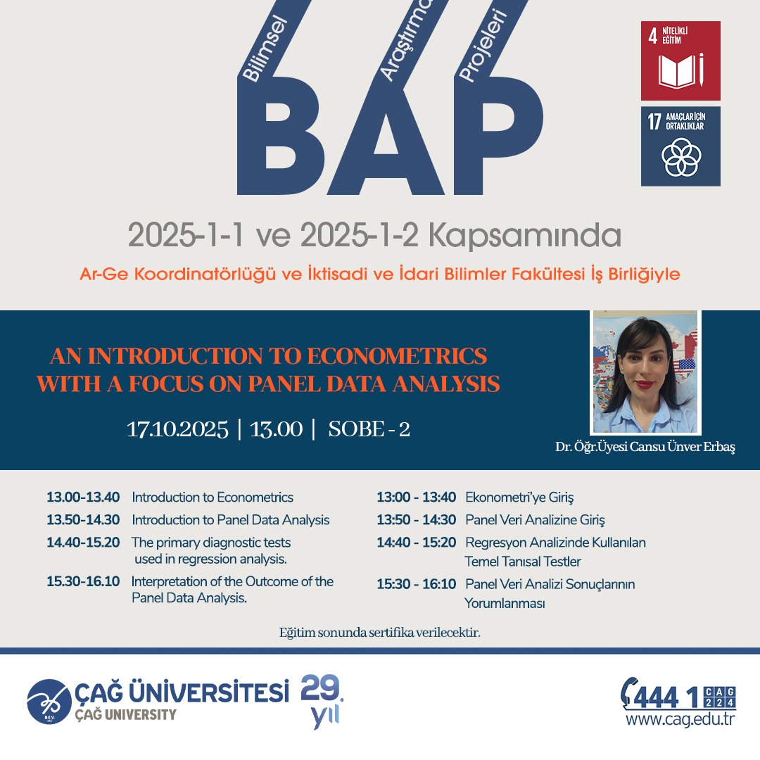 BAP Projesi kapsamında Dr. Öğr.Üyesi Cansu Ünver ERBAŞ'ten Panel Veri Analizi Eğitimi 17.10.2025 -SOBE-22de yapılacaktır.