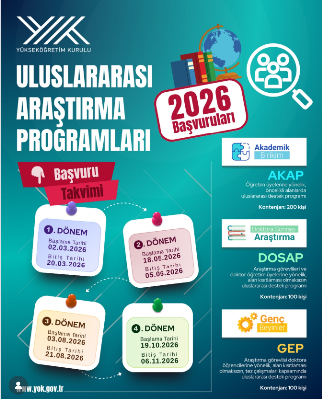 🔗Ayrıntılı bilgi için: https://www.yok.gov.tr/tr/announcements/yokten-uluslararasi-arastirma-programlari-2026-yili-basvuru-takvimi-duyurusu-IEBs4