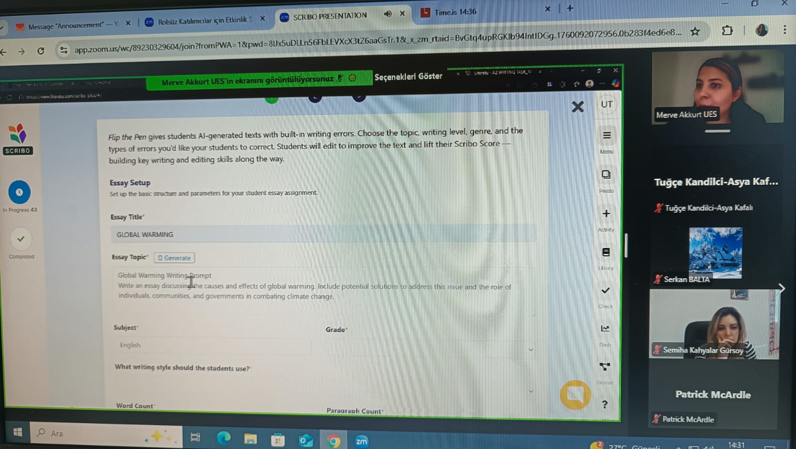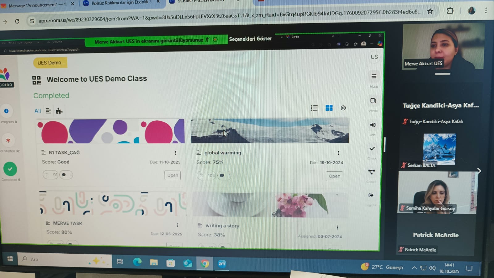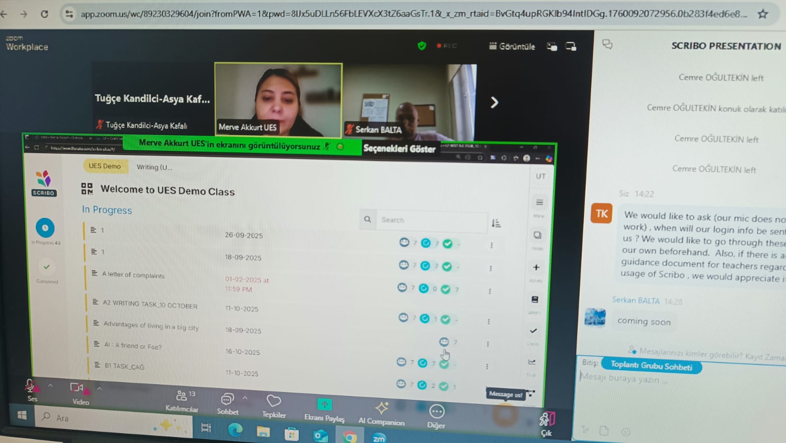 Yabancı Diller Yüksekokulu öğretim elemanlarına yönelik olarak, Macmillan tarafından 11 Ekim Cuma günü saat 13:30’da Zoom üzerinden Scribo platformunun kullanımıyla ilgili çevrimiçi bir eğitim düzenlenmiştir. Eğitimde platformun temel işleyişi, öğrencilerin yazma görevlerine geri bildirim sağlamak amacıyla okuma ve yazma derslerimizde kullanımı hakkında kapsamlı bilgiler sunulmuş, başlıca özellikleri ayrıntılı olarak açıklanmış ve katılımcılar uygulamalı egzersizlerle platformun işlevlerini deneyimleme fırsatı bulmuştur.
